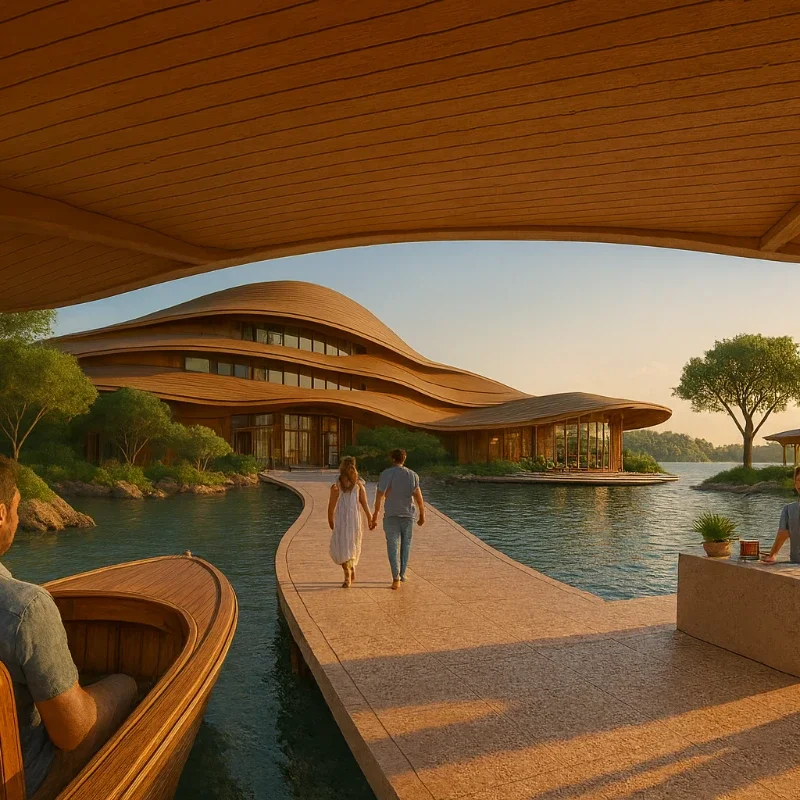Concept: A low-impact archipelago resort where overwater rings, dune villas, and a reef research hub form a visible halo in the lagoon. Architecture reads as sculptural from the air, intimate at human scale.