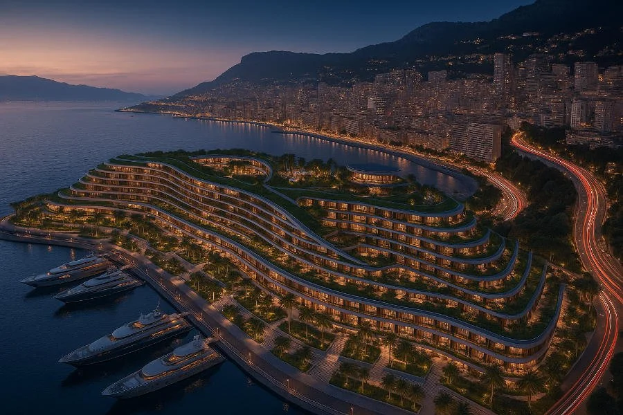 Concept: A terraced ultra-luxury resort on a reclaimed marina edge in Monaco, with a continuous sky-park ribbon that links hotel, branded residences, and a members’ beach club.