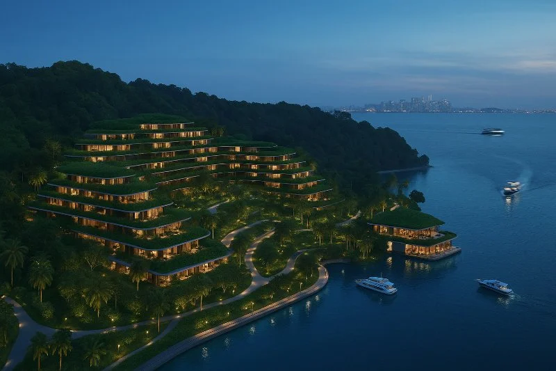 Concept: Ultra-luxury resort on Sentosa’s south shore, a terraced garden that steps from rainforest crest to lagoon edge. Sky-forest bridges connect hotel wings, branded villas, and a members’ reef club.