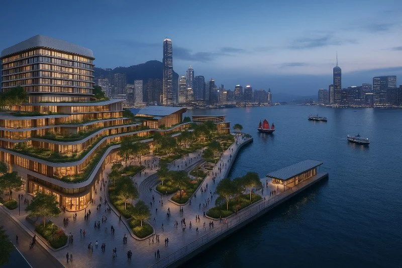 Concept: A mixed use waterfront quarter on Victoria Harbour, a terraced sky garden that stitches hotel, branded residences, grade A offices, culture and F&B into one public promenade that glows from Kowloon to Hong Kong Island.